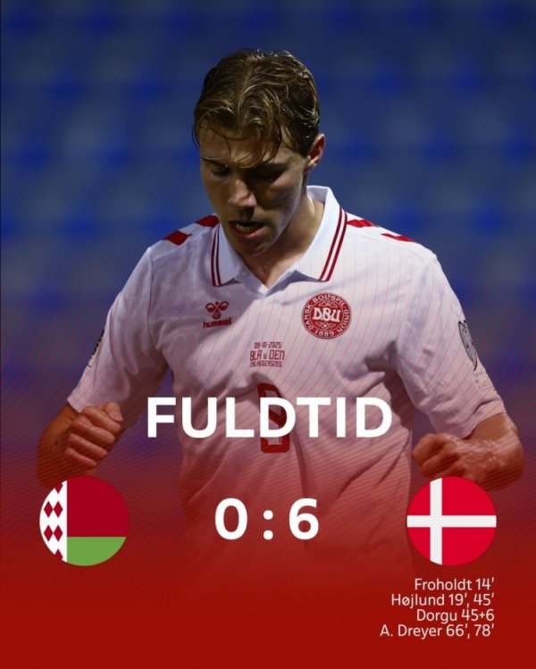 世预赛丹麦6-0大胜白俄罗斯,霍伊伦、德雷尔连进两球+多古破门德甲积分榜最新排名 10月10日讯 世预赛欧洲区小组赛,丹麦客场应战 6-0大胜白俄罗斯。 此役上半场弗罗霍尔特为丹麦首开记录,霍伊伦连进两球,多古取得得分 ,丹麦4-0领跑 ,下半场德雷尔双响,最终丹麦6-0大胜白俄罗斯。 此役过后德甲积分榜最新排名,丹麦2胜1平积7分排名小组第一,白俄罗斯3战皆负小组垫底。