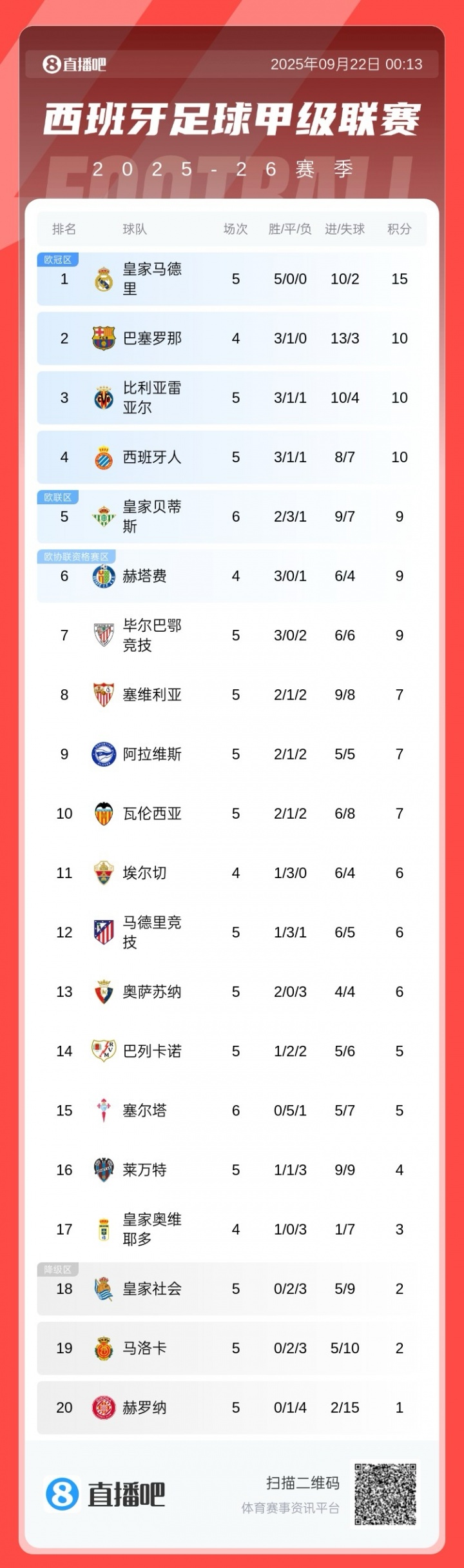 9月22日讯 今日西甲马德里竞赛 客场应战 战平马洛卡拜仁德甲新赛季首秀,英超比赛在线观看无插件最新西甲积分榜如图。凌晨三点巴塞罗那将对阵赫塔费。