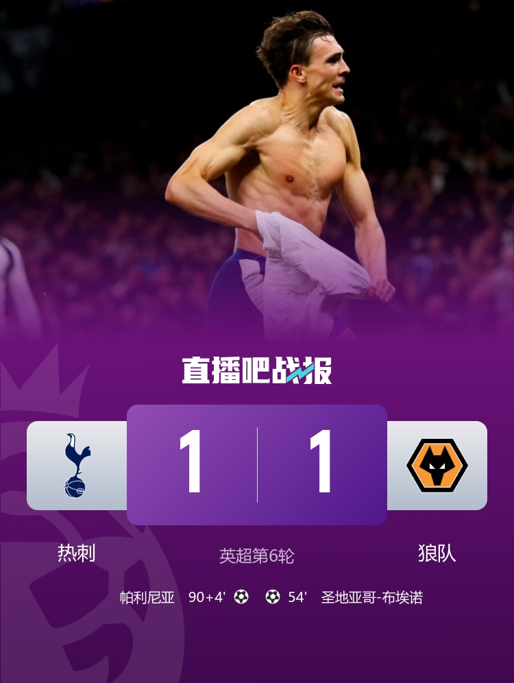09月28日讯 英超第6轮,热刺补时阶段惊现扳平狼队,英超比赛在线观看无插件目前热刺与狼队交手已连续6场不胜,并且在狼队5连败后送其本赛季首个积分。