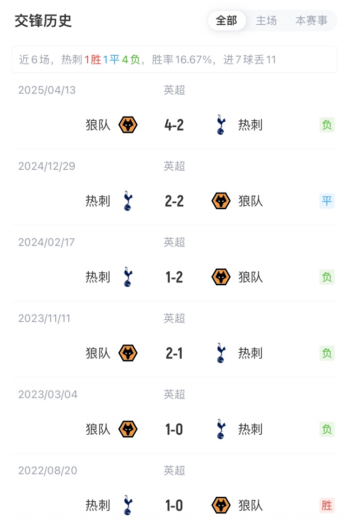 热刺此前对阵狼队战绩: