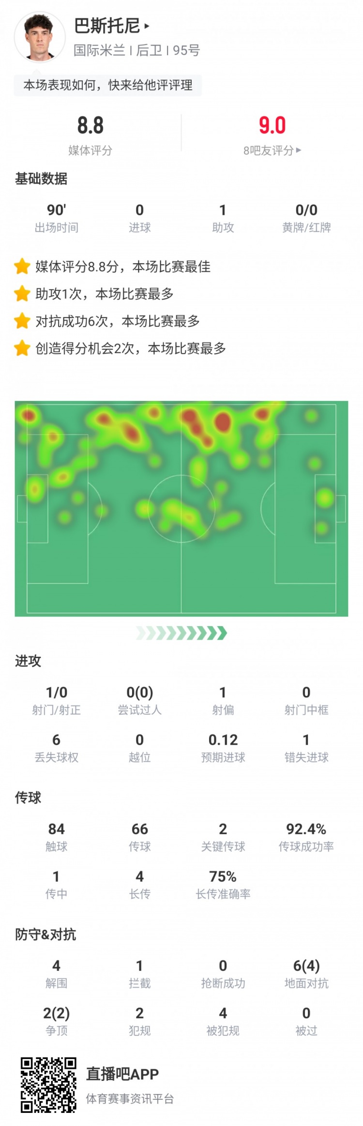 10月1日讯 国米在本轮欧冠3-0大胜布拉格斯拉维亚,巴斯托尼杆位出场踢满90分钟,英超直播以下是他的个人数据: