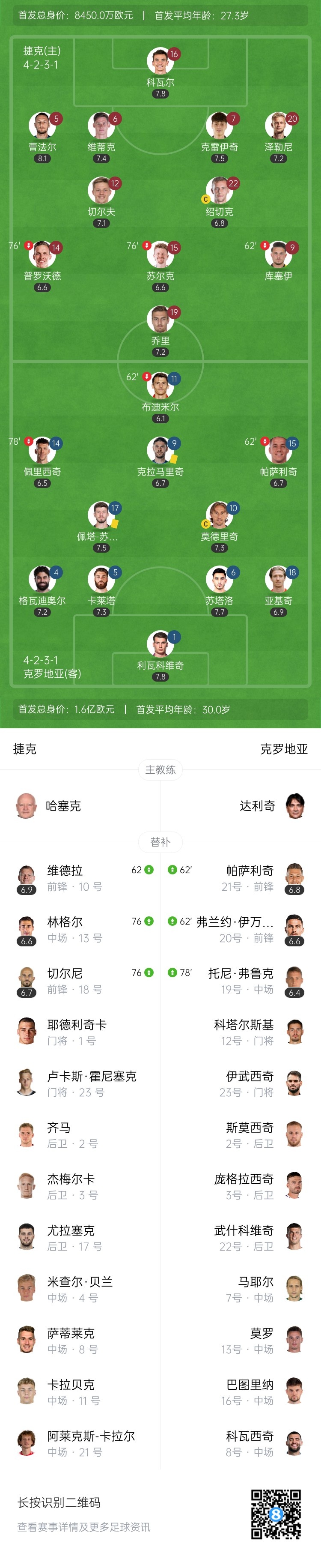 本场赛事 过后,克罗地亚5战4胜1平,以13个积分位列榜首,捷克多赛1场以4胜1平1负拿到13个积分位列第二。