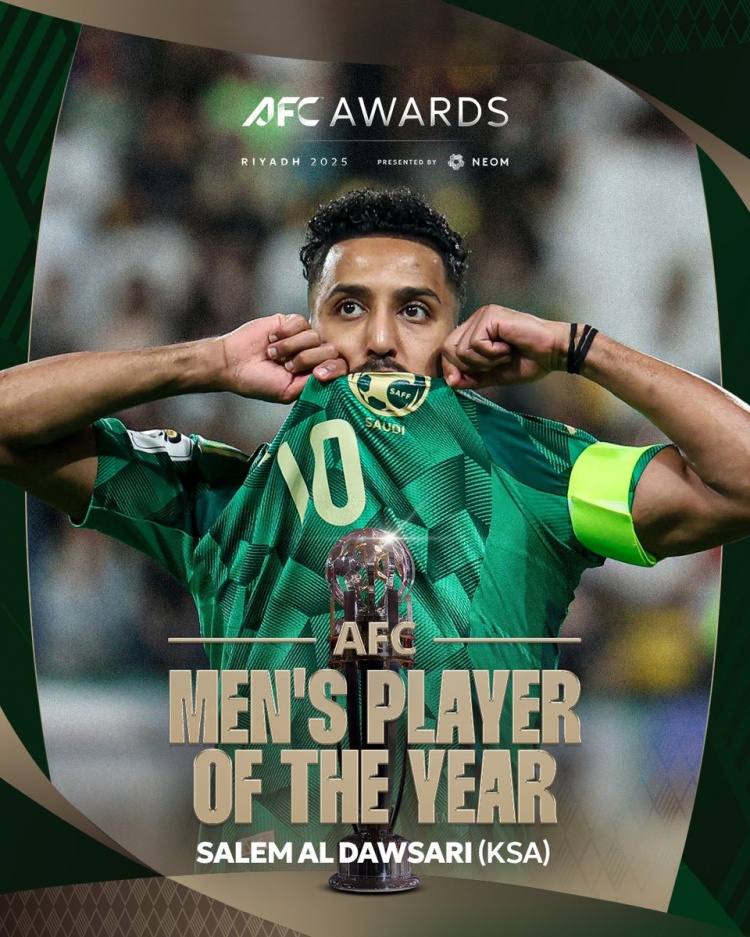 官方消息,利雅得新月34岁翼锋萨利姆-多萨里当选2025年亚足联最佳球员。