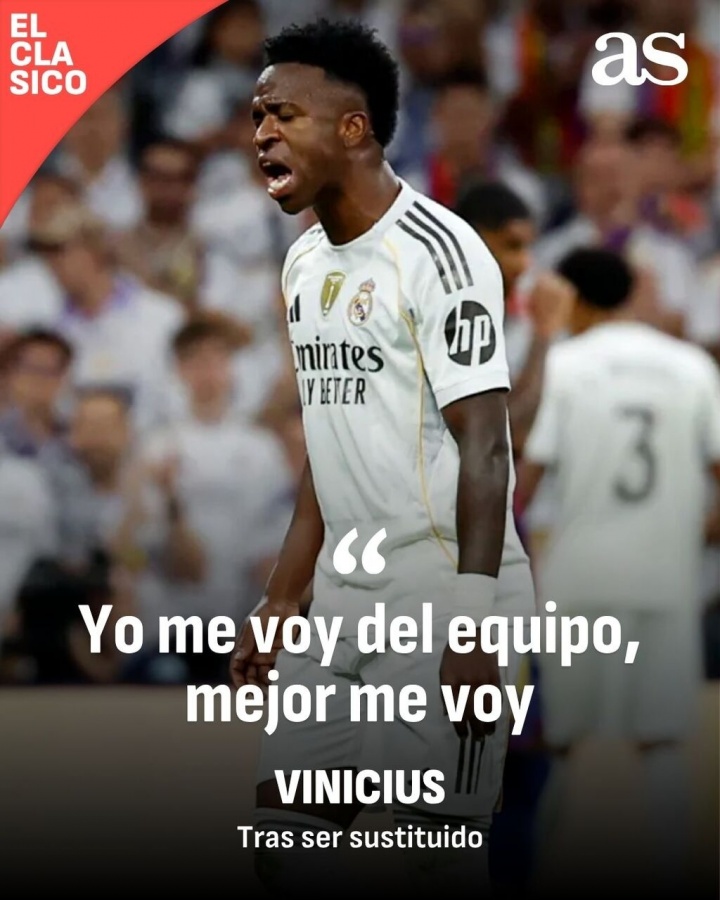 10月27日讯 本轮西甲,皇马主场作战 2-1战胜巴塞罗那,赛事 中维尼修斯被换下时非常愤怒,阿斯报报道了当时的情形。