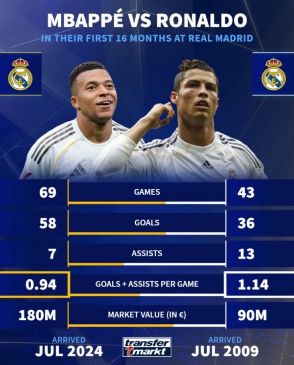 效力皇马前16个月数据:姆巴佩69场58球7助,C罗43场36球13助德甲积分榜最新排名 10月8日讯 姆巴佩已为皇马效力16个月,德国转会市场统计了他与C罗在皇马同期的数据。 姆巴佩、C罗效力皇马前16个月数据: 赛事 ——69比43 得分 ——58比36 助功 ——7比13 场均加入 得分 ——0.94比1.14 当时德回转 价——1.8亿欧比9000万欧德甲积分榜最新排名