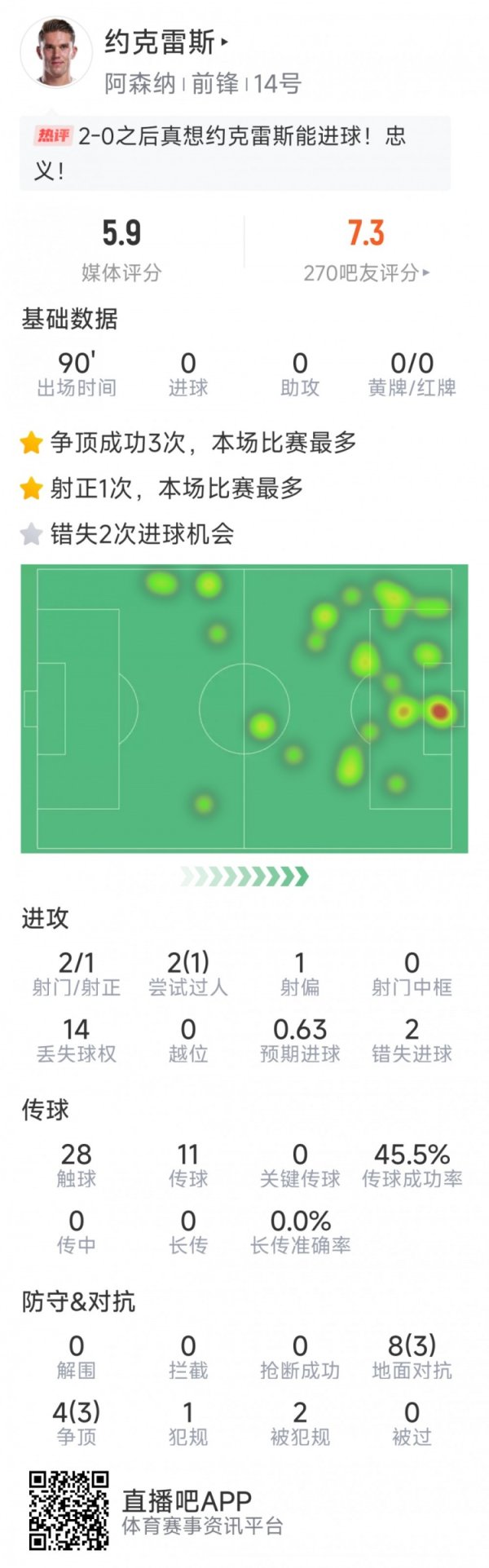 约克雷斯本场数据:2射1正,2次错失良机,6次成功对峙网易新闻 10月5日讯 在本轮英超,阿森纳2-0击败西汉姆。以下为约克雷斯本场数据: 赛事 时间90分钟 0球0助功 2射1正 2次错失良机 28次触球 传送球 成功率46% 12次对峙 6次成功 评分5.9分网易新闻