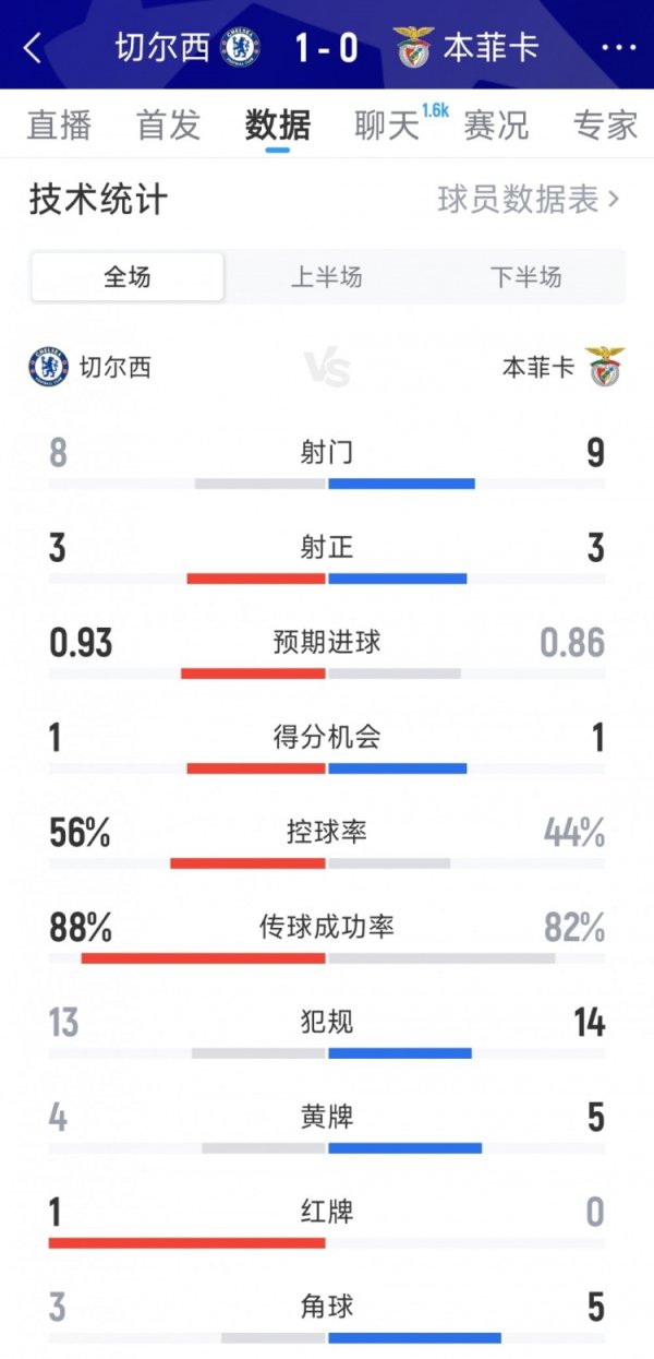 切尔西1-0本菲卡全场数据:射正8-9,射正3-3,警告 4-5,驱逐 1-0网易新闻 10月1日讯 在本轮欧冠,切尔西1-0击败本菲卡,以下为双方全场数据对比: 切尔西vs本菲卡 射球 :8-9 射正:3-3 预期得分 :0.93-0.86 积分 机会:1-1 盘带时间 :56%-44% 违例 :13-14 警告 :4-5 驱逐 :1-0 底线球:3-5网易新闻