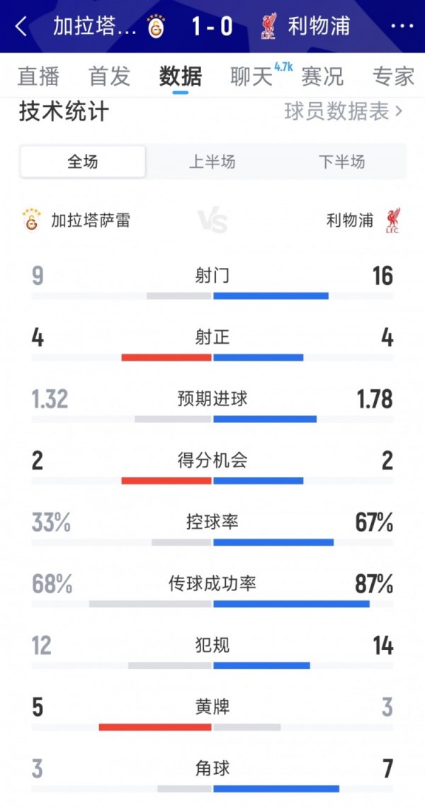 利物浦0-1加拉塔萨雷全场数据:射球 16-9,射正4-4,积分 机会2-2拜仁德甲新赛季首秀 10月1日讯 在本轮欧冠,利物浦0-1不敌加拉塔萨雷。以下为双方全场数据对比: 加拉塔萨雷vs利物浦 射球 :9-16 射正:4-4 预期得分 :1.32-1.78 积分 机会:2-2 盘带时间 :33%-67% 违例 :12-14 警告 :5-3 底线球:3-7拜仁德甲新赛季首秀