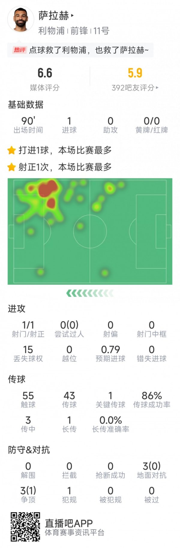 十二码球致胜球 ,萨拉赫本场数据:仅1次射球 ,6次对峙 1次成功,0过人网易新闻 9月14日讯 在本轮英超,利物浦1-0险胜伯恩利。萨拉赫打进十二码球完成致胜球 ,以下为他在本场数据: 赛事 时间90分钟 1粒得分 55次触球 传送球 成功率86% 1次关键传送球 1次射球 6次对峙 1次成功 15次丢失球权 评分6.6分网易新闻