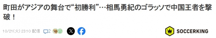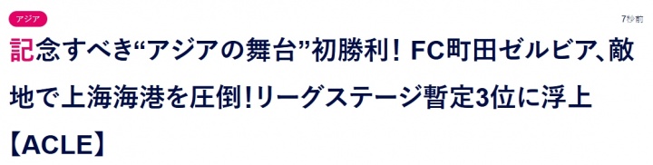 赛后部分日媒的报道标题包括:《值得纪念的“亚洲舞台”首胜!町田泽维亚客场应战 爆冷击败上海海港,暂居亚冠精英职业联赛 第三》、《町田在亚洲赛场的首胜!相马勇纪的出色 得分 帮助球队击败了中国第一名 》等。