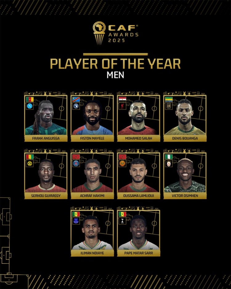 10月22日讯 非洲古代足球 联合会(CAF)公布2025年度最佳球员候选,英超直播萨拉赫、奥斯梅恩、吉拉西、阿什拉夫等10名球员获提名。