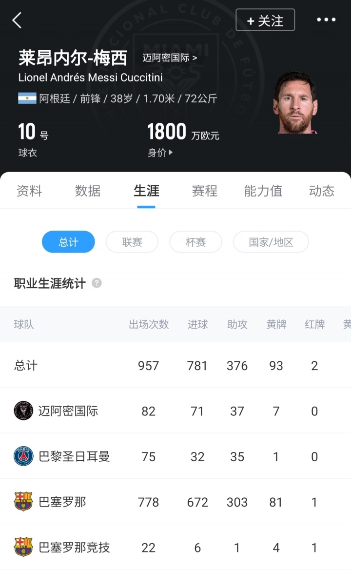 梅西2023年夏窗以自由身加盟迈阿密国际,截至目前共为球队出战82场,打进71球送出37次助功 ,帮助球队夺得了联盟杯第一名 和支持者盾第一名 。此外,梅西在2023/24赛季获评美职职业联赛 季最佳球员。