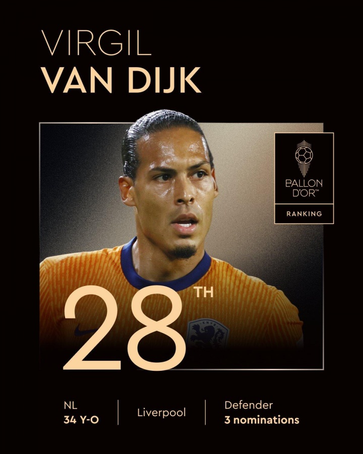 28、范迪克(利物浦/荷兰、34岁,第三次获得提名)