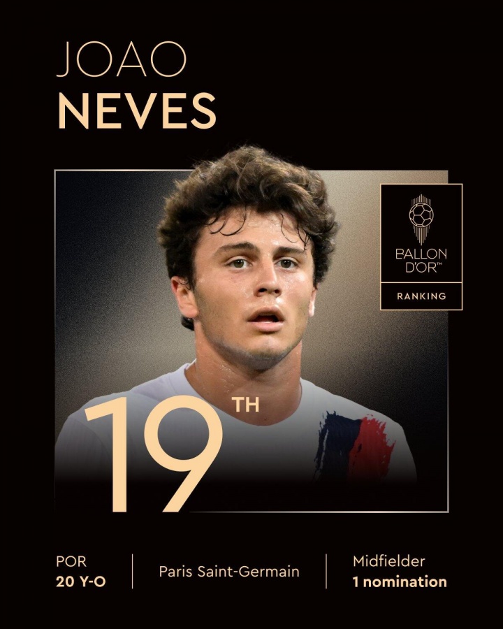 19、若昂-内维斯(巴黎圣日耳曼/葡萄牙、20岁、第一次获得提名)