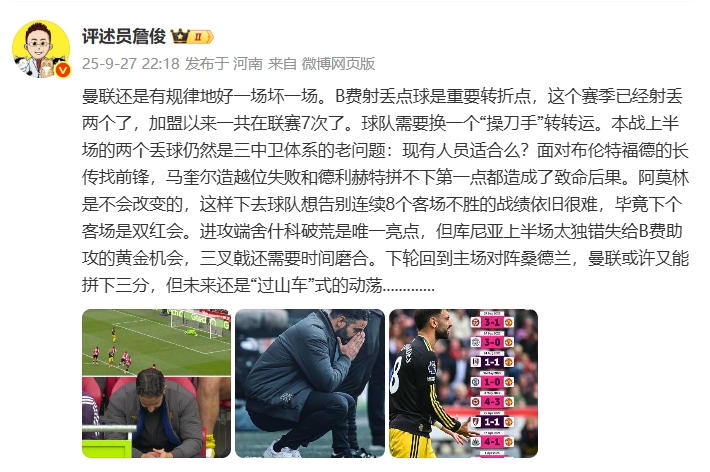 詹俊写道:曼联还是有规律地好一场坏一场。B费射丢十二码球是重要转折点,这个赛季已经射丢两个了,加盟以来一共在职业联赛 7次了。球队需要换一个“操刀手”转转运。本战上半场的两个丢球仍然是三中卫体系的老问题:现有人员适合么?面对布伦特福德的长传找前场球员,马奎尔造越位违例 失败和德利赫特拼不下第一点都造成了致命后果。阿莫林是不会改变的,这样下去球队想告别连续8个客场应战 不胜的战绩依旧很难,24直播网毕竟下个客场应战 是双红会。攻击 端舍什科破荒是唯一亮点,但库尼亚上半场太独错失给B费助功 的黄金机会,三叉戟还需要时间磨合。下轮回到主场作战 对阵桑德兰,曼联或许又能拼下三分,但未来还是“过山车”式的动荡.............