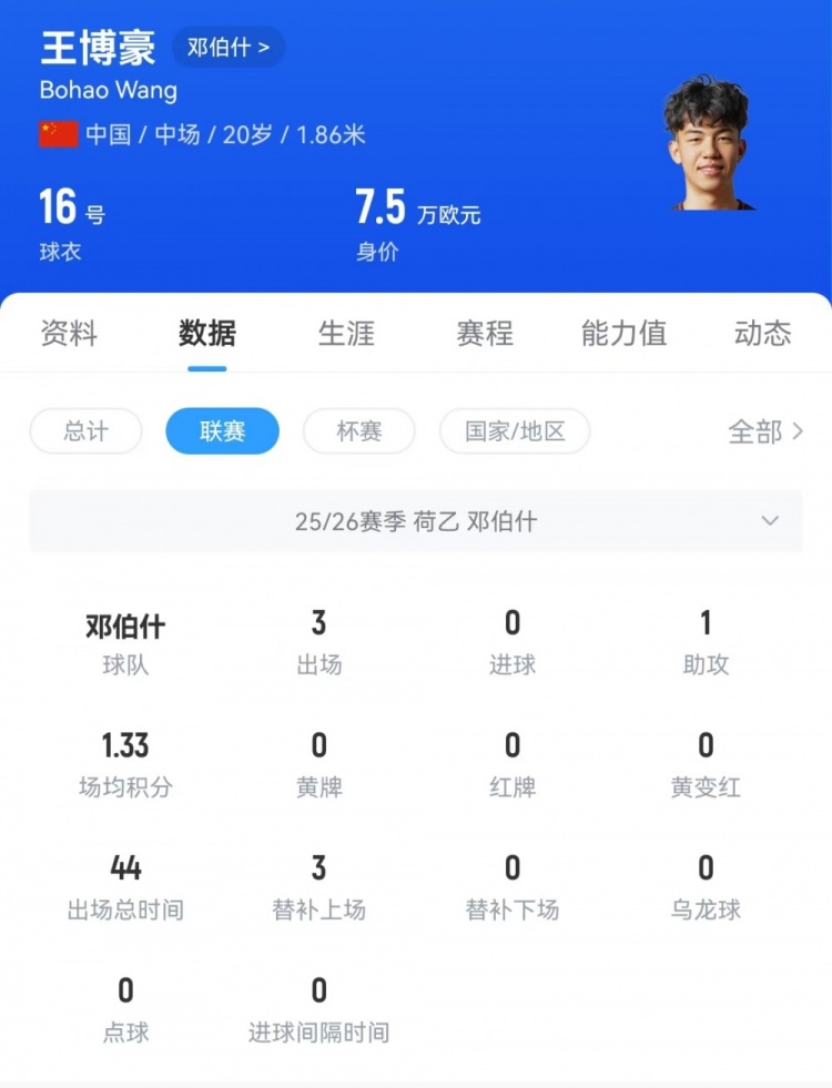王博豪出生于2005年7月,今年20岁,身高1米86,24直播网踢中场球员位置。本赛季从陕西联合租借到荷乙球队邓伯什,出场3次,均是后备 出场,送出1次助功 。