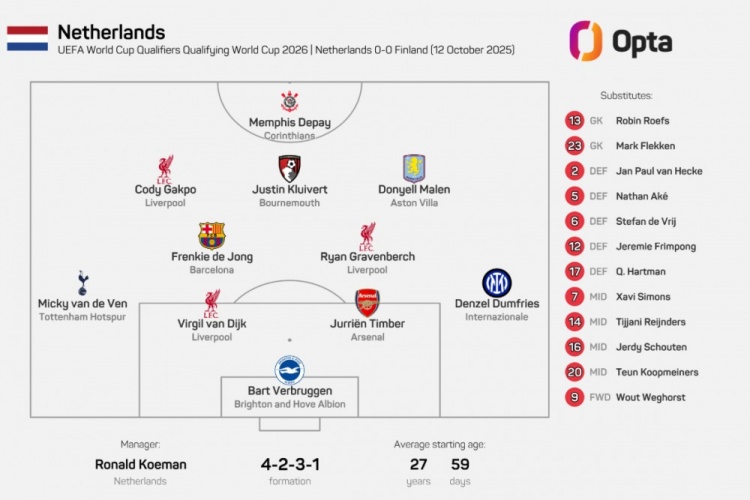 10月13日讯 世预赛欧洲区小组赛,荷兰在主场作战 迎战芬兰。本场赛事 ,荷兰再次排出了没有任何一名荷甲球员的杆位阵形 ,英超免费在线高清直播这是橙衣军团今年第5次做出如此安排。此前,荷兰国家队所有年份没有排出荷甲球员的杆位阵形 也仅有5次而已。