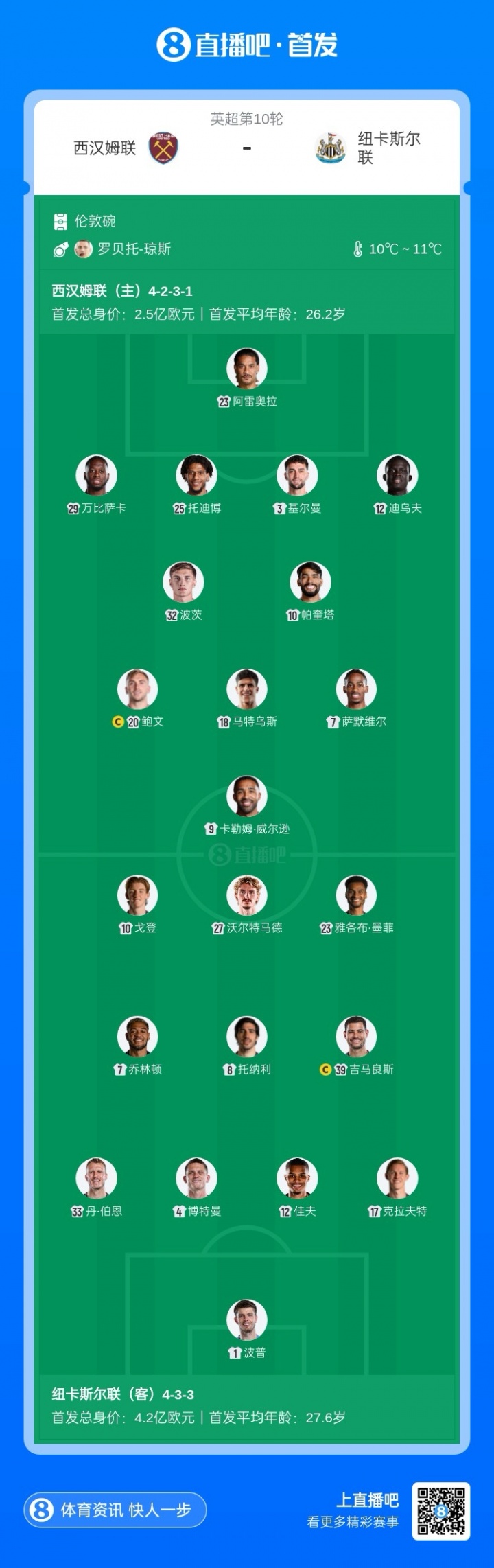 11月02日讯 北京时间22:00,英超第10轮,西汉姆联vs纽卡,赛前双方杆位公布!【本场赛事 西汉姆联方面,威尔逊出任单箭头,波茨、帕奎塔搭档中场球员,英超免费在线高清直播纽卡方面沃尔特马德出任五号位,吉马良斯,托纳利坐镇中场球员】