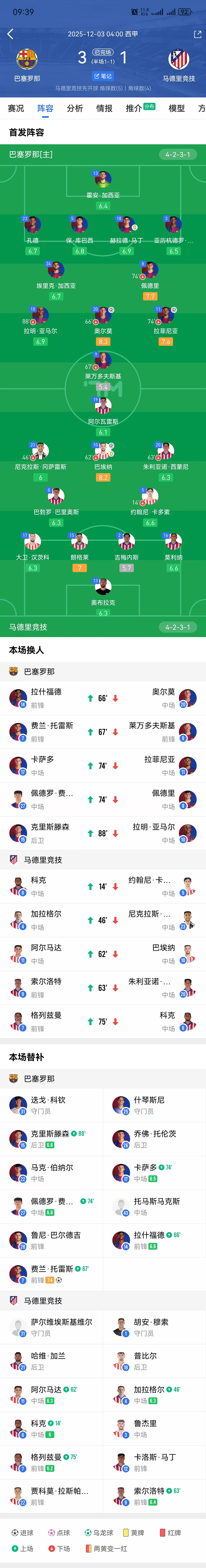 24直播网被科克换下,此前他在一次对峙 中负伤 。 第15分钟,亚马尔右路摆脱防卫 ,随后尝试一脚兜射,打飞了。 第31分钟,库巴西顶球解围险些让马竞获得单刀赴会球机会,霍安·加西亚出击解围。 第38分钟,亚马尔右路送出传中,莱万顶球攻门,奥布拉克反应快速 将球扑出。 第41分钟,巴埃纳撞翻库巴西,吃到警告 。 上半场加时补赛4分钟,第45+2分钟,马丁铲翻朱利亚诺·西蒙尼,吃到警告 。 半场结束,巴萨暂1-1马竞。 易边再战,第52分钟,危险区域 内阿尔瓦雷斯小角度挑射,被霍安·加西亚没收。 第53分钟,亚马尔右路内切,随后送出斜传,拉菲尼亚无人盯防低射远角,偏出了远门柱。 第54分钟,马竞组织攻势,危险区域 内朱利亚诺·西蒙尼接到队友做球,跟进射球 偏得有些多。 第58分钟,拉菲尼亚横传门前,莱万抢点稍慢错失良机。 第69分钟,亚马尔接到队友斜传,突入危险区域 兜射远角打偏了。 第79分钟,阿尔马达接到队友直塞,单刀赴会球机会突入危险区域 没有直接射球 ,连续摆脱后将防卫 球员晃得人仰马翻,不过最后的射球 打偏了。 下半场加时补赛6分钟,第90+3分钟,拉什福德危险区域 内摆脱后低射近角,被奥布拉克挡出。 全场赛事 结束,最终巴萨3-1马竞。 【双方杆位以及替换队员 信息】 巴塞罗那杆位:13-霍安·加西亚、3-巴尔德、5-库巴西、18-赫拉德·马丁、23-孔德、24-埃里克·加西亚、8-佩德里(73'' 27-德罗·费尔南德斯)、9-莱万(67'' 14-拉什福德)、10-亚马尔(88'' 15-克里斯滕森)、11-拉菲尼亚(73'' 17-卡萨多)、20-奥尔莫(67'' 7-费兰) 巴塞罗那后备 :25-什琴斯尼、31-迭戈·科肯、26-托伦茨、22-伯纳尔、28-巴德吉、43-托米·马奎斯 马德里竞赛 杆位:13-奥布拉克、16-莫利纳、2-吉梅内斯、15-朗格莱、17-汉茨科、5-卡尔多索(14'' 6-科克(75'' 7-格列兹曼))、8-巴里奥斯、10-巴埃纳(62'' 11-阿尔马达)、20-朱利亚诺·西蒙尼(62'' 9-瑟尔洛特)、23-尼古拉斯·冈萨雷斯(46'' 4-加拉格尔)、19-阿尔瓦雷斯 马德里竞赛 后备 :1-穆索、31-埃斯基韦尔、3-鲁杰里、18-普比尔、21-加兰、12-卡洛斯-马丁、22-拉斯帕多里