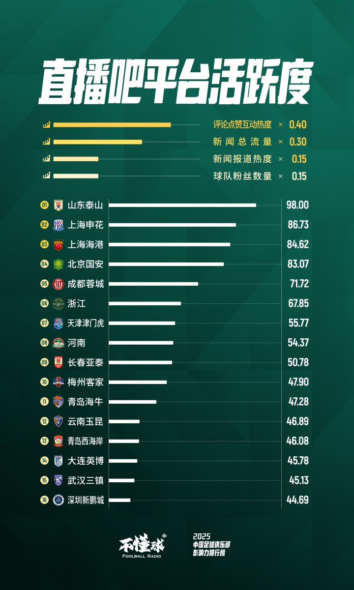 在平台活跃度方面,山东泰山98分居首,英超免费在线高清直播上海申花、上海海港位列二三,北京国安排名第四,成都蓉城第五。