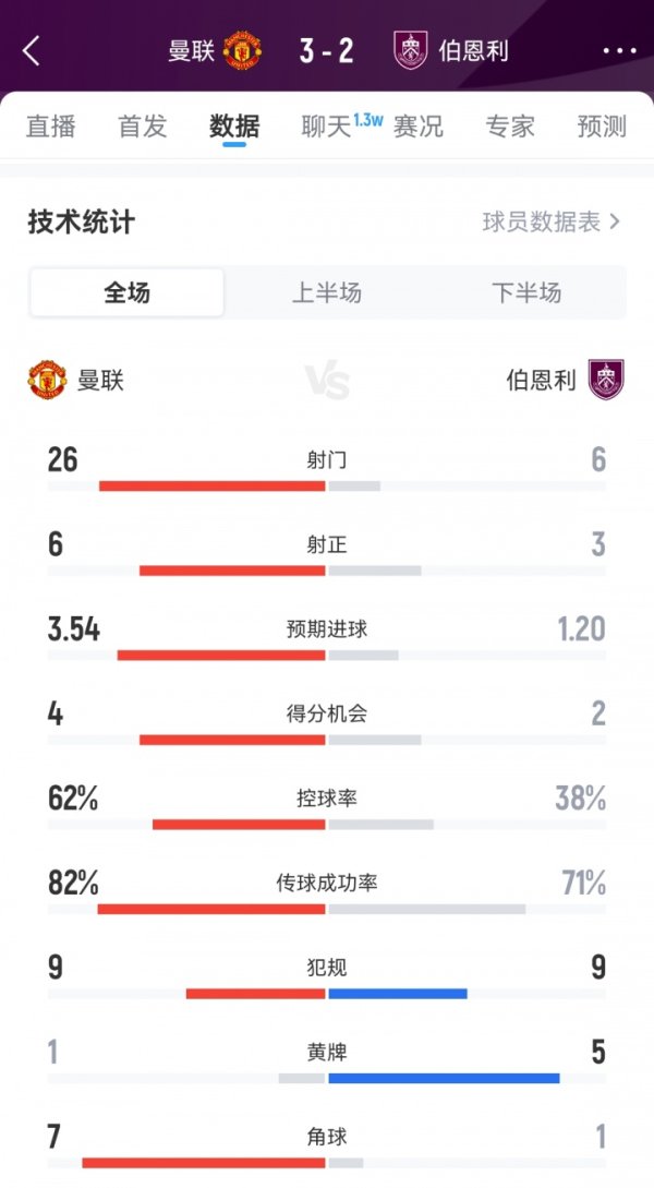 射球 26-6!曼联3-2伯恩利数据:射正6-3,盘带时间 62%-38%,底线球7-1