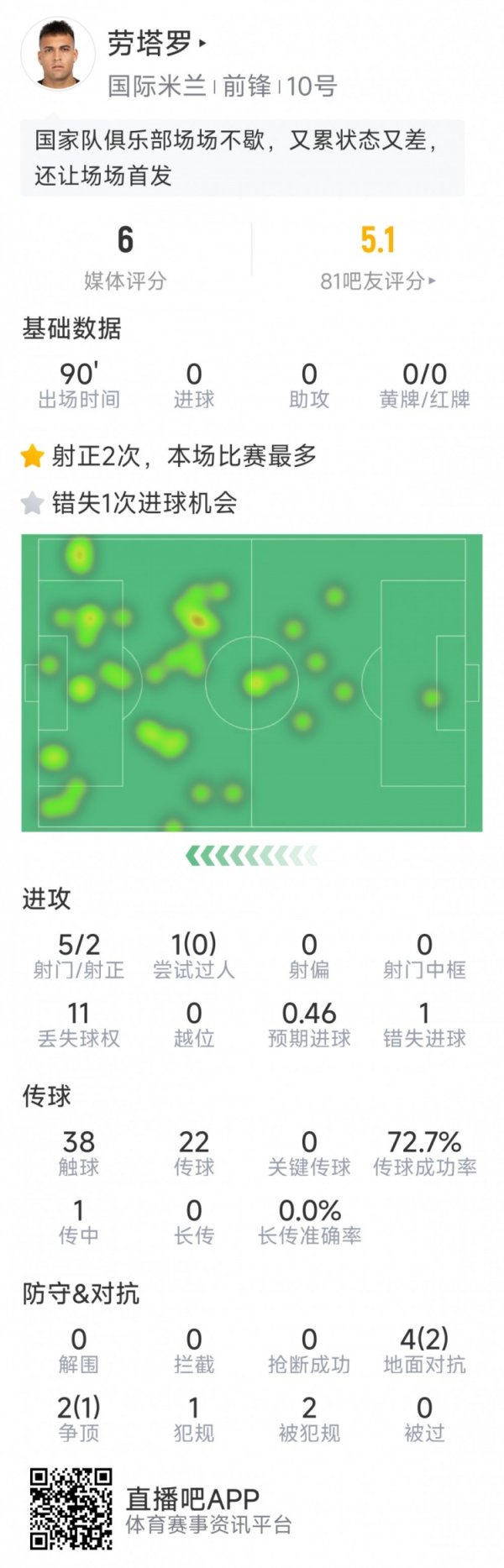 还需调整,劳塔罗本场数据:5射2正,1次错失良机,评分全队最低德甲新闻 11月2日讯 在本轮意甲,国米2-1击败维罗纳。本场赛事 劳塔罗杆位登场打满全场,以下为他在本场数据: 赛事 时间90分钟 5射2正 1次错失良机 38次触球 传送球 成功率73% 6次对峙 3次成功 评分6分(全队杆位最低)德甲新闻
