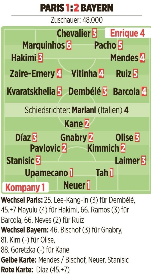 图片报评分:孔帕尼、诺伊尔1分、迪亚斯3分,马金6分、主裁4分新浪体育意甲新闻 11月5日讯 巴黎在本轮欧冠焦点战主场作战 1-2不敌拜仁,马尔基尼奥斯送礼、迪亚斯双响后染红,《图片报》在赛后为两队进行了评分:(1分最佳、5分最差,6分相当于负分) 主裁判 :马里亚尼(意大利),4分 巴黎圣日耳曼评分: 主指导教练员:恩里克,4分 - 守门员:舍瓦利耶,3分 - 后场球员:阿什拉夫,3分
