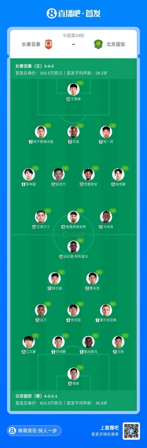 亚泰vs国安杆位:艾菲尔丁、彭欣力先发,杨立瑜、塞尔吉尼奥出战11月01日讯 11月1日15:30德甲新闻,中超第29轮长春亚泰vs北京国安。赛前双方杆位公布。 长春亚泰杆位:28-王智峰、2-阿不都海米提-阿不都格尼、5-李申圆、15-徐浩峰、17-贺一然、31-苏祖(F)、25-西普里安(F)、35-彭欣力、10-奥莫伊胡安弗(F)、27-卡米洛(F)、40-艾菲尔丁 长春亚泰后备 :