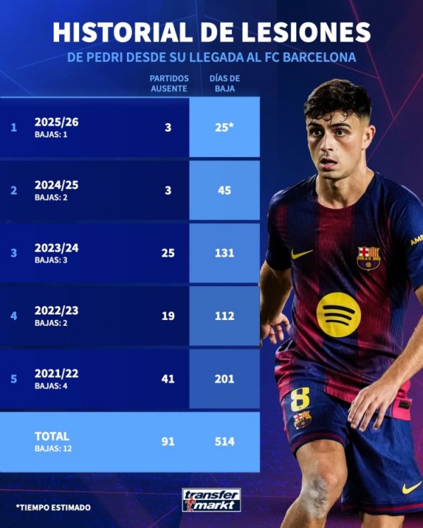 再次负伤 !佩德里近5个赛季负伤 休战12次,缺席91场赛事 、514天拜仁最新准确消息新闻 10月30日讯 巴萨中场球员佩德里左侧大腿远端股二头肌撕裂,德国转会市场更新社媒动态,盘点佩德里加盟巴萨以来每个赛季的受伤 情况。 佩德里近5个赛季受伤 情况: 21-22——4次负伤 休战——缺席41场201天 22-23——2次负伤 休战——缺席19场112天 23-24——3次负伤 休战——缺席25场