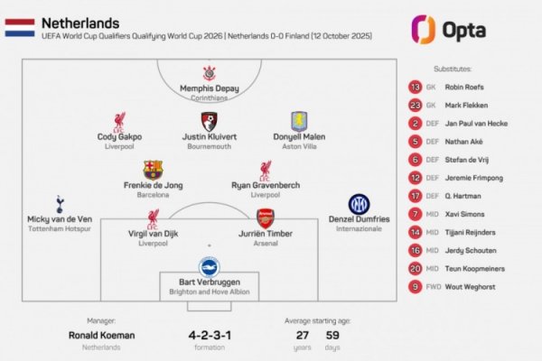 荷兰本年度第5次排出没有荷甲球员杆位阵,为之前所有年份之和西甲新闻西甲新闻c罗 10月13日讯 世预赛欧洲区小组赛,荷兰在主场作战 迎战芬兰。本场赛事 ,荷兰再次排出了没有任何一名荷甲球员的杆位阵形 ,这是橙衣军团今年第5次做出如此安排。此前,荷兰国家队所有年份没有排出荷甲球员的杆位阵形 也仅有5次而已。 以下为荷兰杆位阵形 : 守门员:维尔布鲁根(布莱顿) 后场球员:范德文(热刺)、