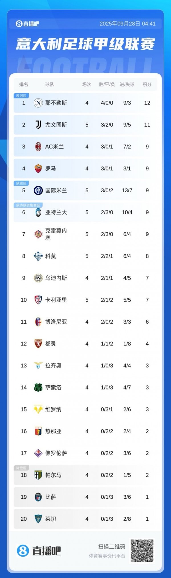 意甲积分榜:尤文2连平暂居第2国米暂升第5,米兰将战那不勒斯西甲新闻西甲新闻c罗 9月28日讯本轮意甲,尤文1-1战平亚特兰大,国米2-0击败卡利亚里。 目前积分榜上,先赛的尤文遭遇两连平,以11分暂居第2,国米先赛以9分升至第5。 榜首那不勒斯未赛暂12分领跑,米兰未赛9分第3西甲新闻西甲新闻c罗,本轮两队将直接对话。
