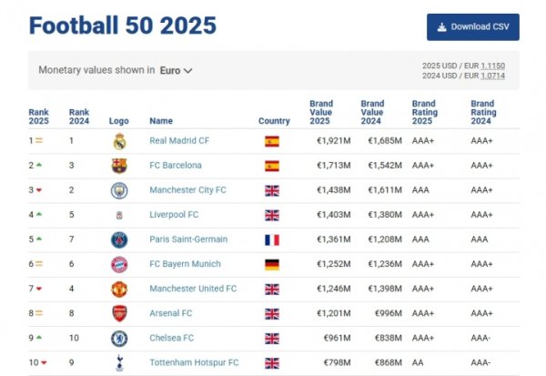 2025最具价值古代足球 品牌:皇马19.21亿第1 巴萨第2 英超big6均前十意甲最新战况 08月14日讯 品牌评估机构Brand Finance发布了2025年全球最具价值古代足球 品牌,其中皇马以19.21亿欧蝉联榜首,巴萨17.13亿欧第2,曼城跌至第3,曼联跌至第7。 Brand Finance2025全球最具价值古代足球 品牌↓ 1.皇马 19.21亿欧 2.巴萨 17.13亿欧 3.曼城 14