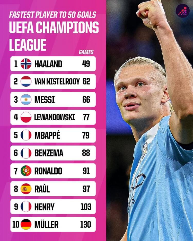 这场赛事 的得分 让哈兰德的个人欧冠得分 达到50球。这让他创造了新历史。他是欧冠50球最快达成球员。他只用了49场,跨越 了梅西、姆巴佩和C罗这些超级球星。梅西欧冠打进50球用了66场赛事 ,姆巴佩则用了79场,至于C罗,他用了91场。对比之下,可见哈兰德的得分 效率有多高,在欧冠的射球 质量有多高。哈兰德现在只有25岁,只要保持强健 竞技状态 ,他在未来还会打破很多历史记录 。