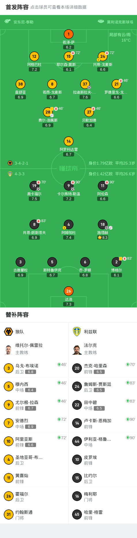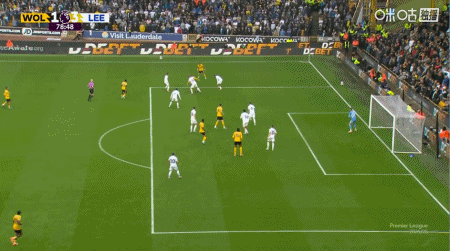第31分钟,博格尔右路传中,勒温顶球破门,利兹联1-1狼队