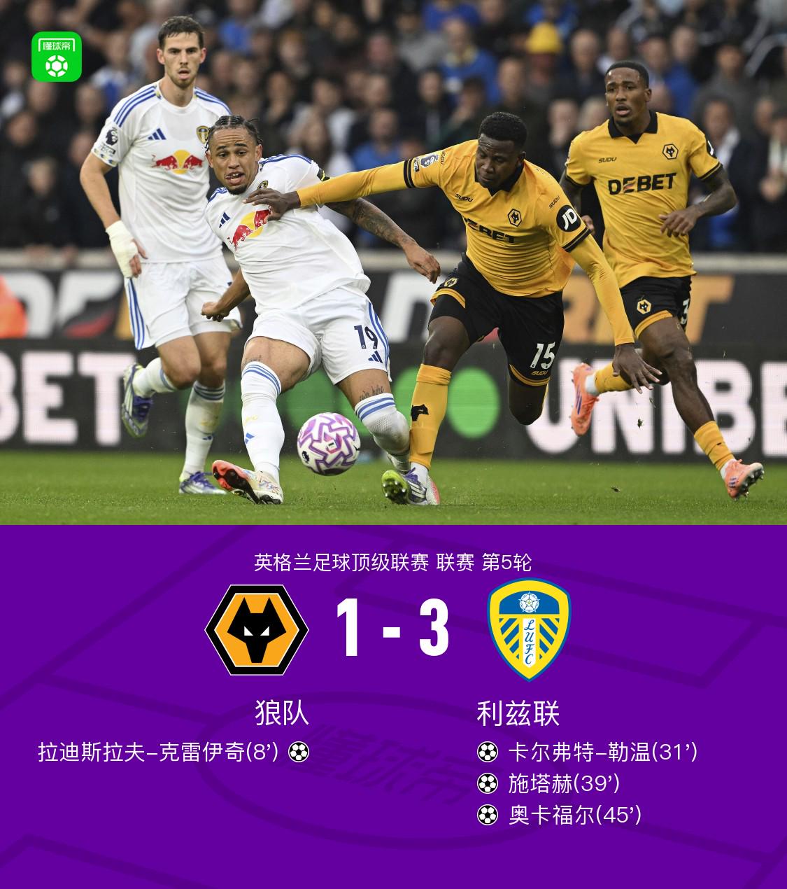 北京时间9月20日最新足球消息,英格兰古代足球 顶级职业联赛 第5轮展开角逐,狼队坐镇主场作战 迎战利兹联。赛事 伊始,费尔-洛佩斯送出精准助功 ,拉迪斯拉夫-克雷伊奇抓住机会率先破门,为狼队取得领跑 。此后利兹联逐渐掌控节奏,卡尔弗特-勒温接应攻击 扳平比分。随后施塔赫挺身而出,通过一次高效反击将比分反超。临近上半场结束,施塔赫再献妙传,奥卡福尔冷静推射得手,进一步扩大优势。最终全场赛事 结束,狼队以1比3不敌利兹联。