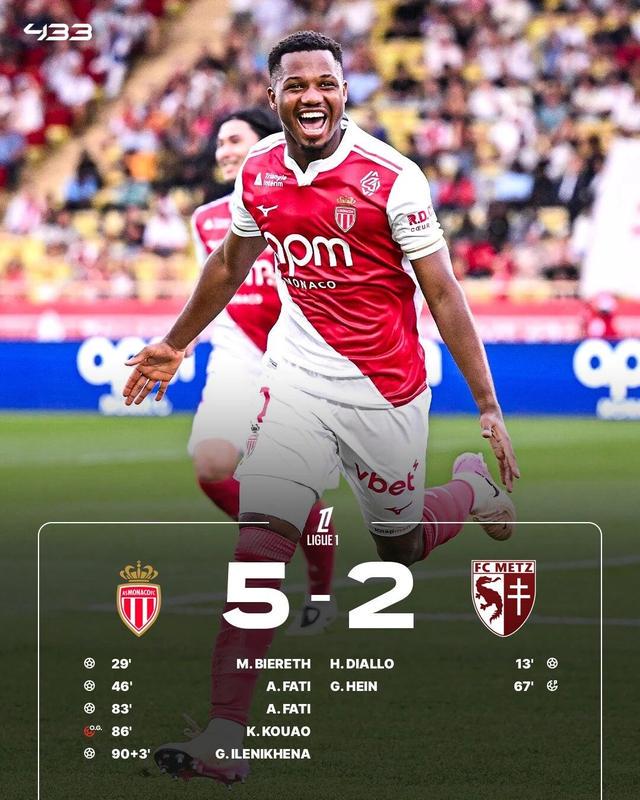 客队在第67分钟通过十二码球扳平了比分,但法蒂再次为摩纳哥队取得领跑 ,这次他用顶球完成了破门。新上场的球员将一个传中球送入危险区域 核心,而这位身穿31号运动活动 服 的球员再次让梅斯的防卫 感到惊讶,他的顶球对于门将费舍尔来说无法阻挡。
