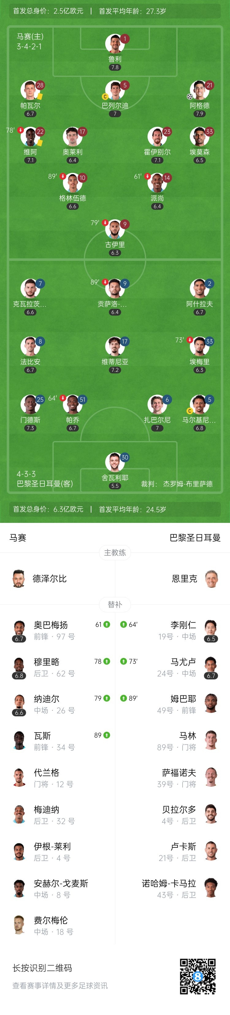 下半场补时5分钟。最终全场赛事 结束,马赛1-0巴黎。
