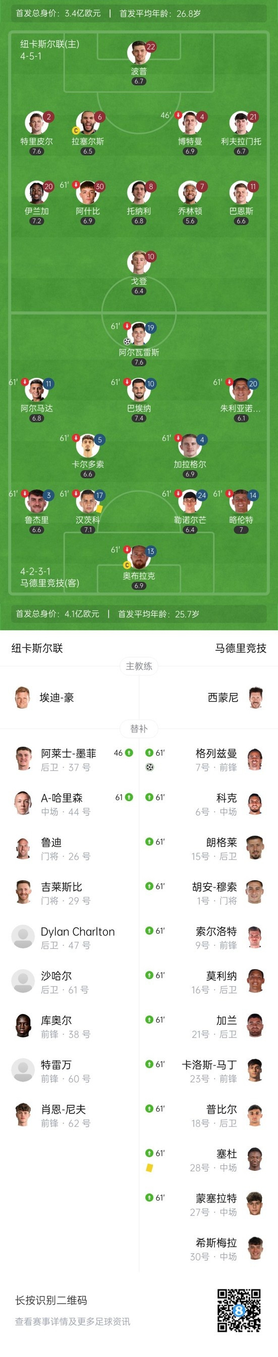 第50分钟,马竞打破僵局!反击机会巴埃纳左路危险区域 横传后点阿尔瓦雷斯包抄破门,纽卡0-1马竞。↓