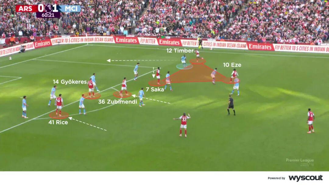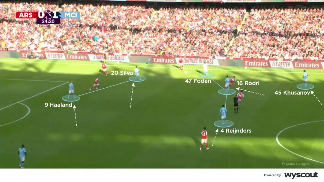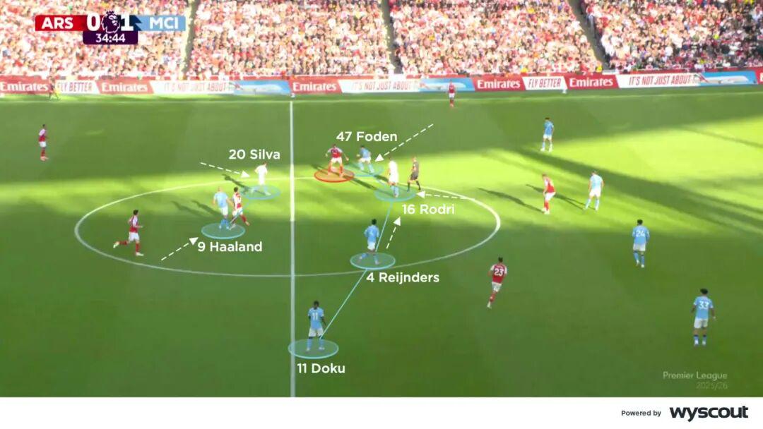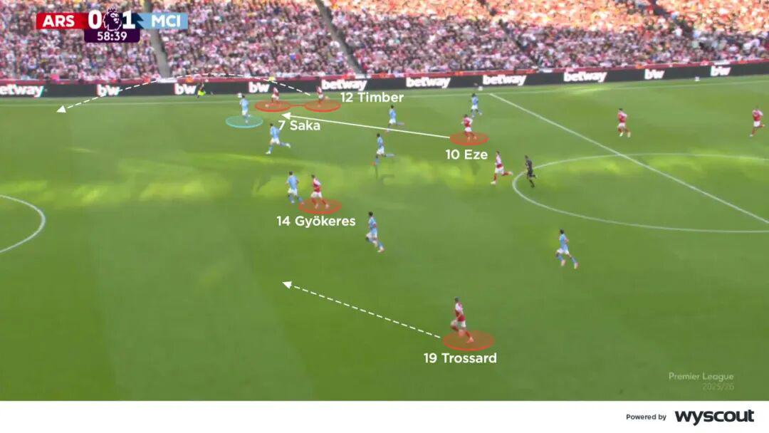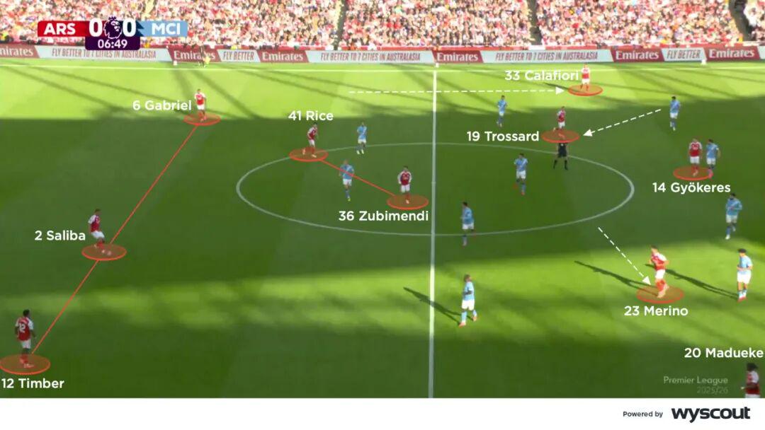 阿森纳在赛事 初段通过左路多变的跑位掌控了球权。另一种情况是当赖斯与苏比门迪在中路,特罗萨德从他原本在左侧的高位边路回撤,卡拉菲奥里前插顶上,梅里诺会经常出现在右侧肋部通道,使阿森纳在最靠前的位置上拥有对曼城四后场球员的人数优势。阿森纳通过不断的短二过一配合制球权,三后场球员与两名更靠后的中轴是传递的核心。