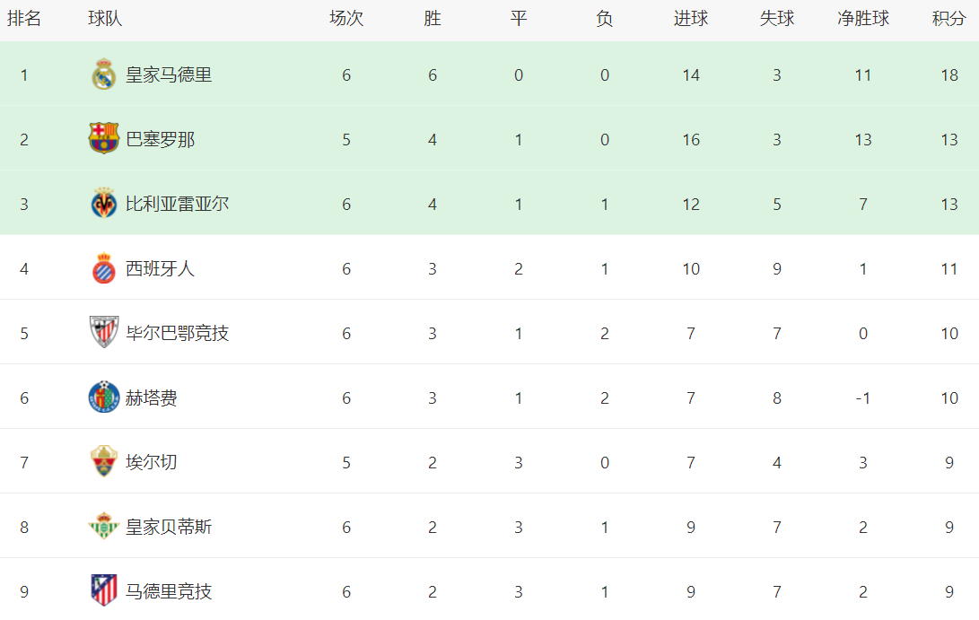 在积分榜上,皇马非常强势,6战全胜以18分排名榜首。巴萨13分紧随其后。巴萨追赶 5分,但比皇马少踢1场。比利亚雷亚尔也是13分,排名第3。第4的是西班牙人足球新闻,拿到11分。毕尔巴鄂竞赛 和赫塔费都是10个积分。而马竞赢下赛事 之后,战绩是2胜3平1负,总积分9分,排名第9!马竞已经掉队,要想冲击第一名 很难很难。