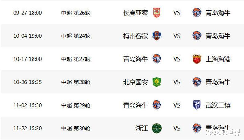 从海牛赛程可见,战罢亚泰,10月4日第24轮补赛客战梅州客家、10月11日第27轮迎战海港,10月26第28轮客战国安,11月2日第29轮主场作战 迎战三镇,11月22日第30轮,客战浙江队。海牛最后6场,对手除了争冠队就是保级对手,浙江队也“六亲不认”,恐怕李霄鹏基本没有“江湖”可玩了!
