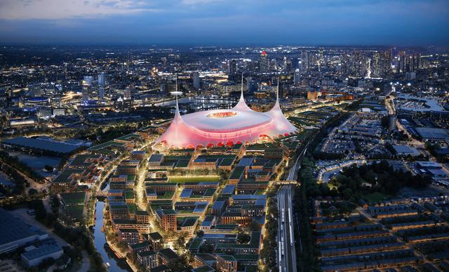 六个月前,Foster + Partners建筑事务所向公众发布的概念图中,这个被评论家比作“马戏团帐篷”的巨大天篷是最引人注目的元素。这座拟议中的10万人容量运动活动 场 本身已配备屋顶,因此天篷——估算建造及安装成本高达3亿至4亿英镑——主要起装饰作用,仅在恶劣天气时为下方人员提供遮蔽,从而增加人们在售货亭或球迷区的停留时间。
