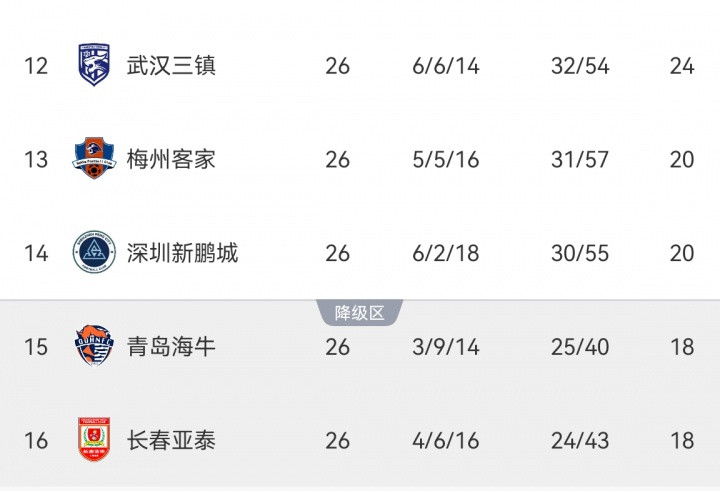 在职业联赛 仅剩4轮的情况下,亚泰与海牛同积18分,而梅州和深圳同积20分。按照规则,赛季结束后中超职业联赛 排名最后两位的球队降入中甲。