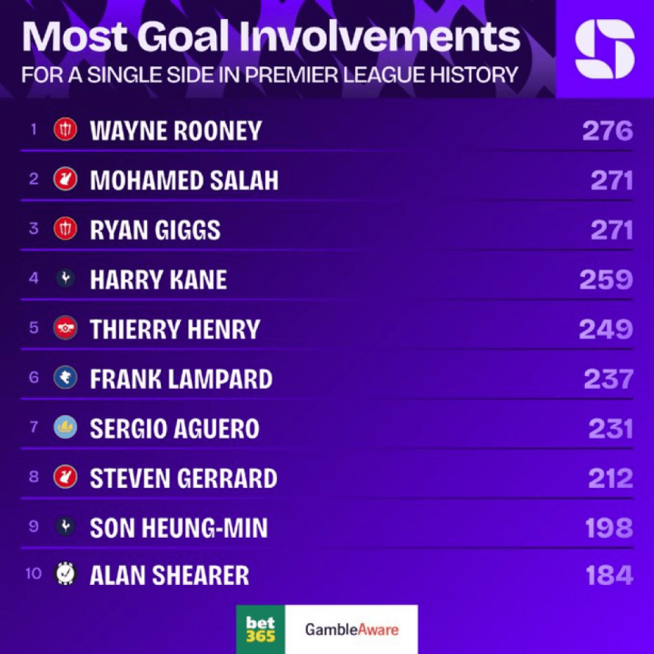 根据Squawka的统计,萨拉赫目前在英超职业联赛 里合计加入 了271个得分 (185球86助),赛事历史中仅次于鲁尼(276)。