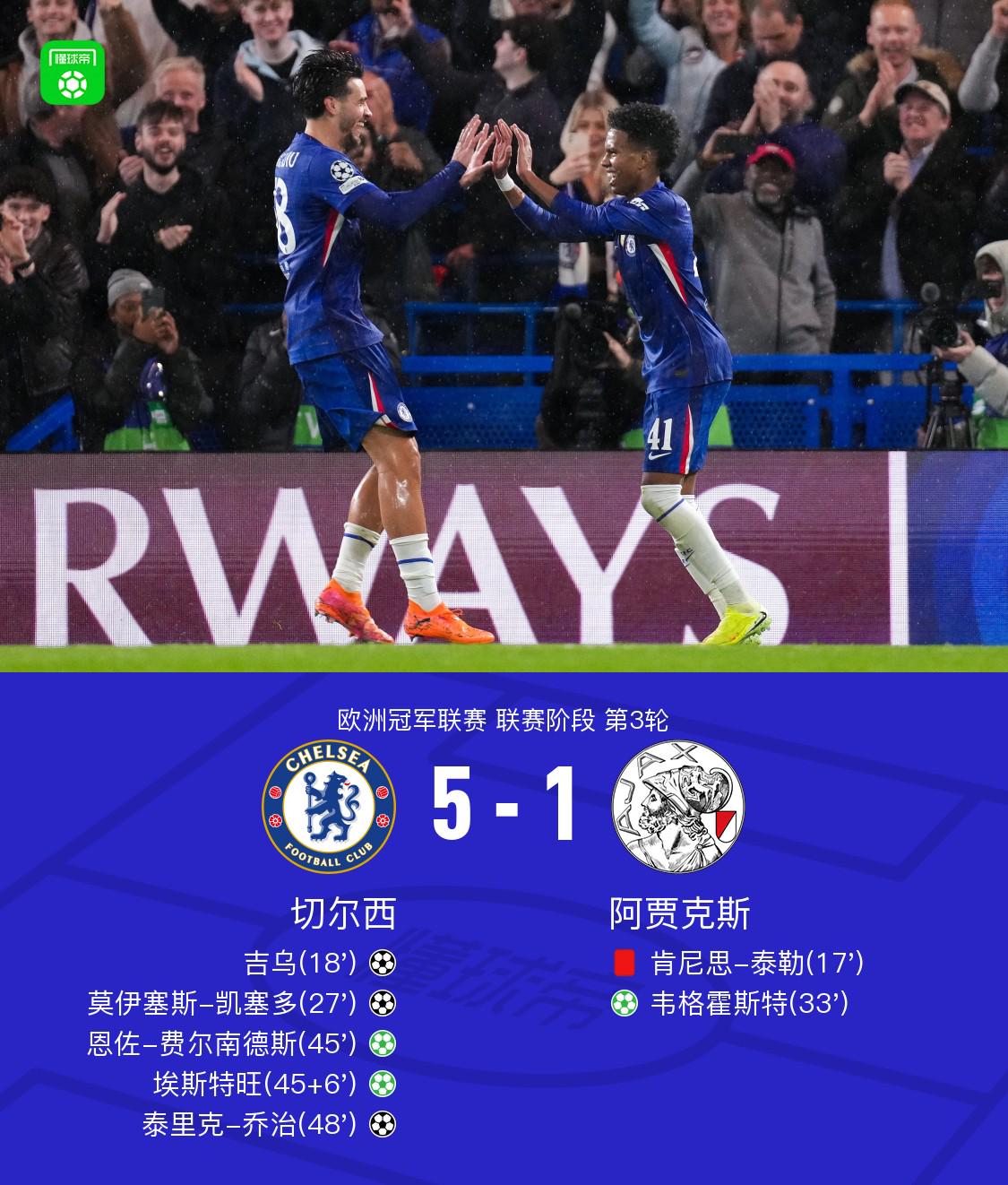 北京时间10月23日欧洲第一名 职业联赛 职业联赛 阶段 第3轮,切尔西对阵阿贾克斯。上半场,泰勒飞铲被直红罚下,阿贾克斯十人应战。福法纳助功 ,吉乌破门。远射,皮球折射入网。阿达拉比奥尤送点,韦格霍斯特主罚命中。随后,韦格霍斯特放倒恩佐送点,恩佐罚入。半场结束前,蓝军再获十二码球,埃斯特旺命中。下半场,乔治破门。全场赛事 结束,切尔西5-1击败十人阿贾克斯。