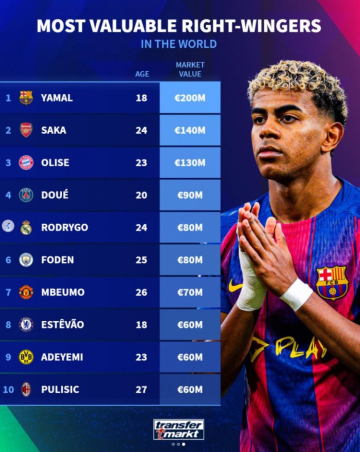 直播吧11月3日讯德转列当前世界足坛右翼锋身价排行,亚马尔2亿欧居首,24直播网萨卡1.4亿欧第二,奥利塞1.3亿欧第三。