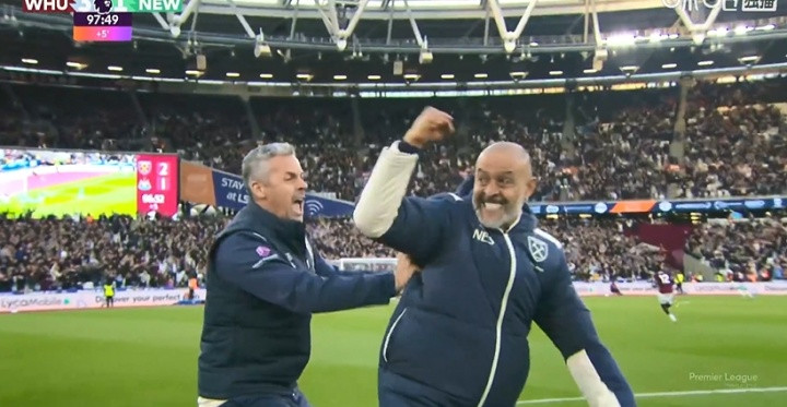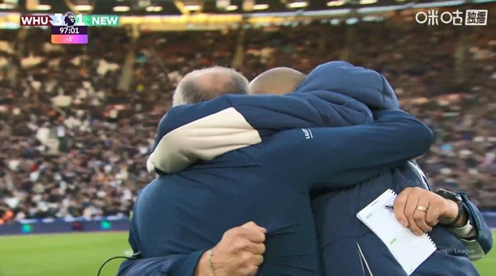 下半场补时第5分钟,英超直播绍切克补射破门帮助西汉姆锁定胜局,主帅努诺在场边与指导教练员组激动相拥。