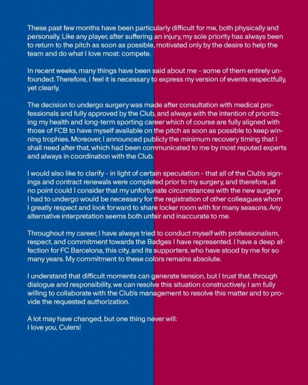 被撤销领队 ! 特狮声明: 伤缺时间急于专家评估 手术与注册无关国足蔡晟 直播吧08月09日讯 特尔施特根近日被巴萨暂时剥夺领队 袖标,球员发表声明,对近期的事情做出回应。 特尔施特根声明: 过去几个月,无论是身体上还是个人生活上,对我而言都异常艰难。和所有球员一样,在负伤 后,我唯一的愿望始终是尽快重返赛场——这份动力纯粹源于帮助球队的渴望,以及做我最热爱的事:奋斗 。 最近几周,关于我的