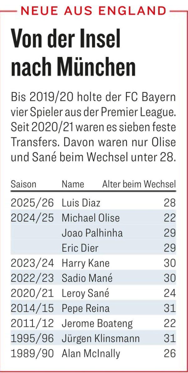 自2020年以来拜仁从英超引进7名球员,此前只引进过4名球员据《射门者》统计,自2020年以来,拜仁慕尼黑已经从英超签下了7名球员。在此之前足球新闻网,他们仅引进了4名球员。 拜仁从英超引进的球员 2025/26赛季:路易斯-迪亚斯 2024/25赛季:迈克尔-奥利塞、帕利尼亚、埃里克-戴尔 2023/24赛季:哈里-凯恩 2022/23赛季:萨迪奥-马内 2020/21赛季:勒鲁瓦-萨