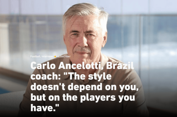安切洛蒂: 作为意大利人执教巴西不难;若遇上…让巴西赢吧国际足球新闻 虎扑09月14日讯巴西国家队主指导教练员安切洛蒂接受队报独家专访。 在古代足球 界,人们常说皇马指导教练员是世界上最难的工作。巴西队指导教练员是第二难的吗? 不,不。这两个工作都很棒,是你所能想象到的最令人兴奋的工作。执教皇马这么久(2013-2015;2021-2025)是一件非常美好的事情。想到我将带领巴西队征